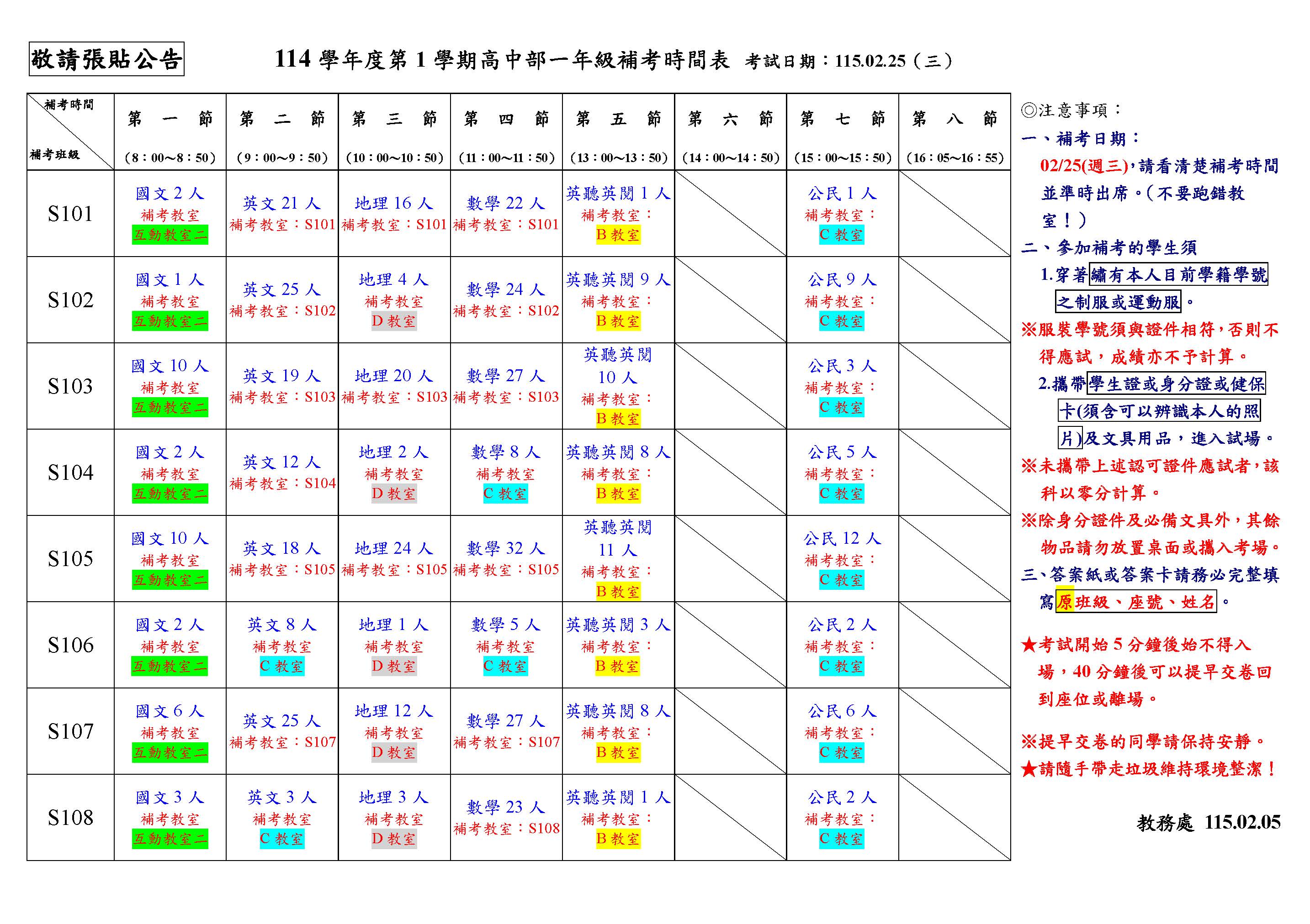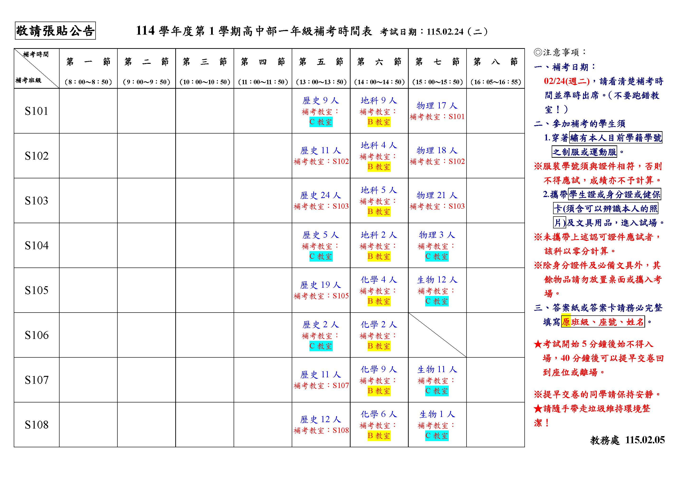 ★在原班教室補考的學生請留意:除身分證件及必備文具外,其餘物品請勿放置於桌面上,須放置於抽屜或教室後方置物櫃。若提早繳卷,請安靜回到座位,不可提早下課或離開教室。