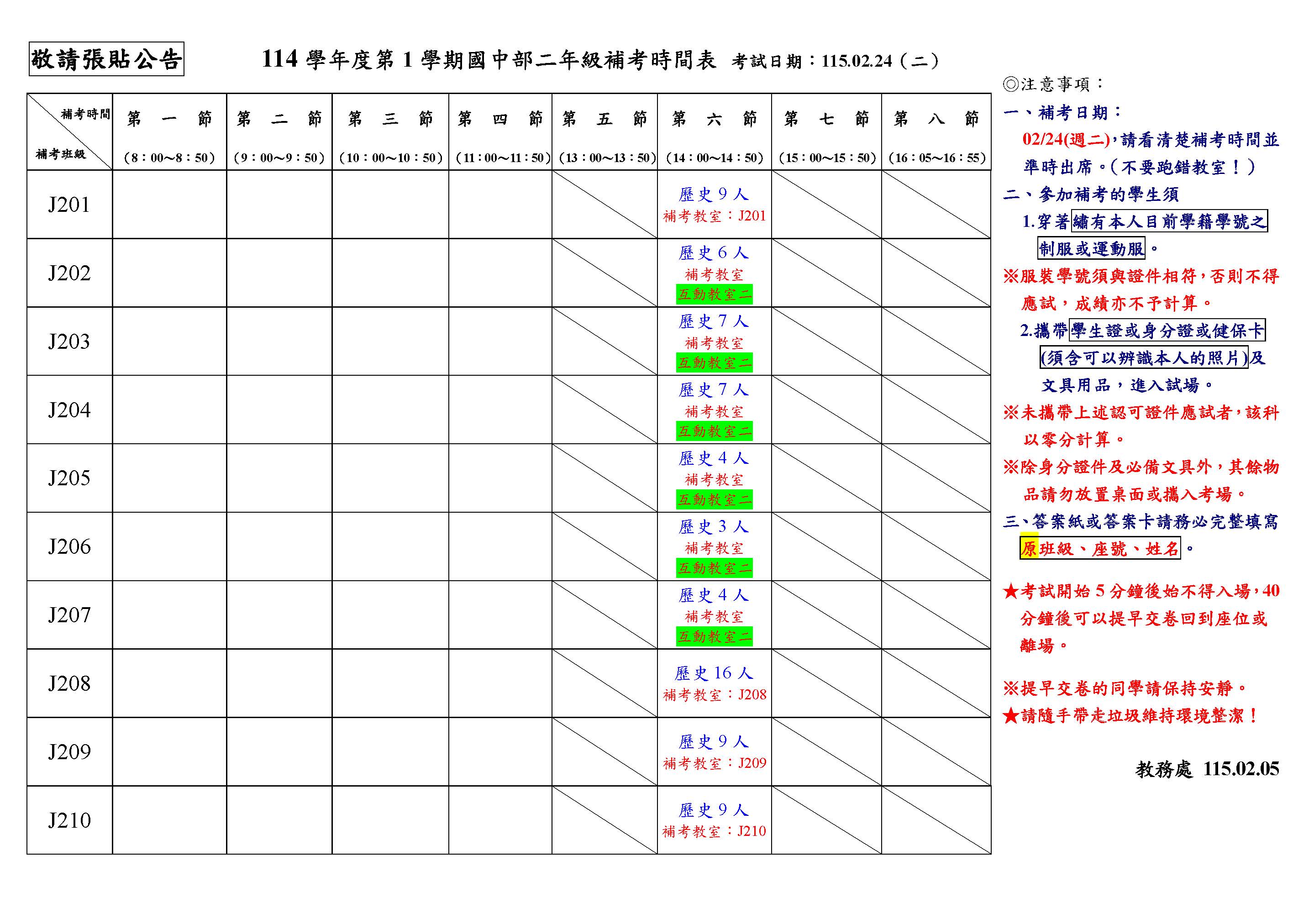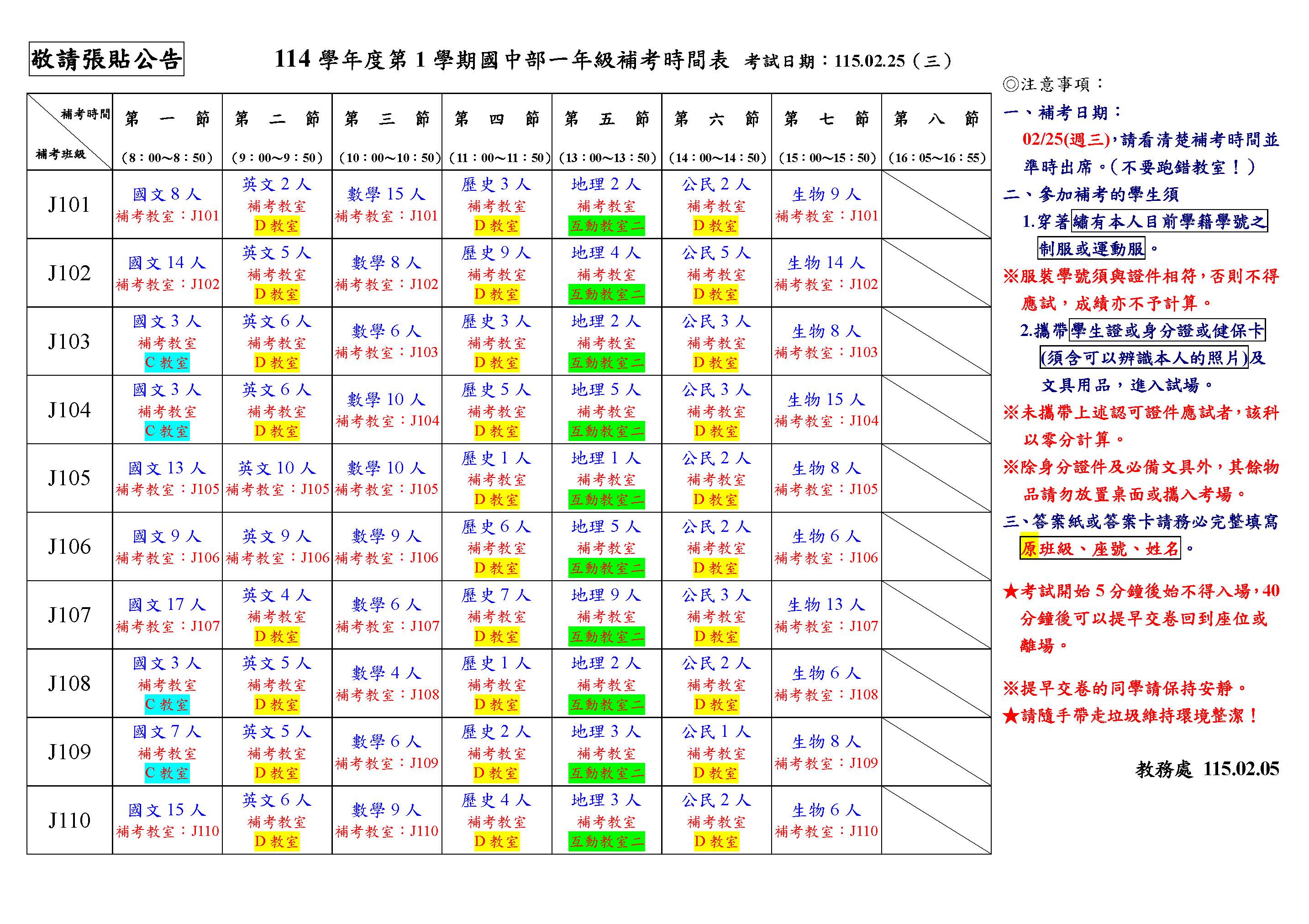 ★抽離式補考的學生請留意:除身分證件及必備文具外,其餘物品請勿攜入座位,須放置於教室前方講臺或教室外。若考程已結束,請安靜回到原班教室,勿影響其他補考同學。並請隨手帶走垃圾維持環境整潔。