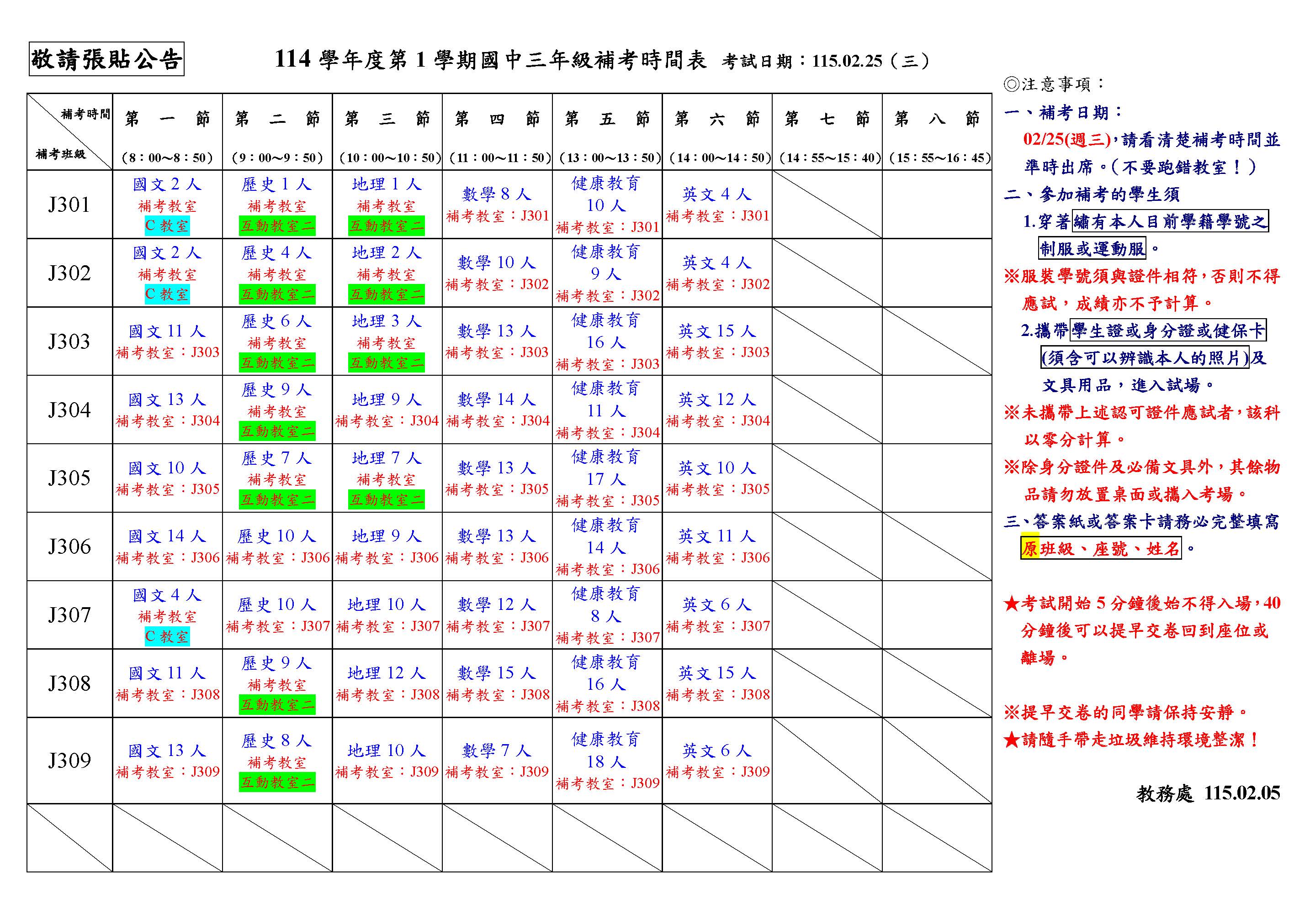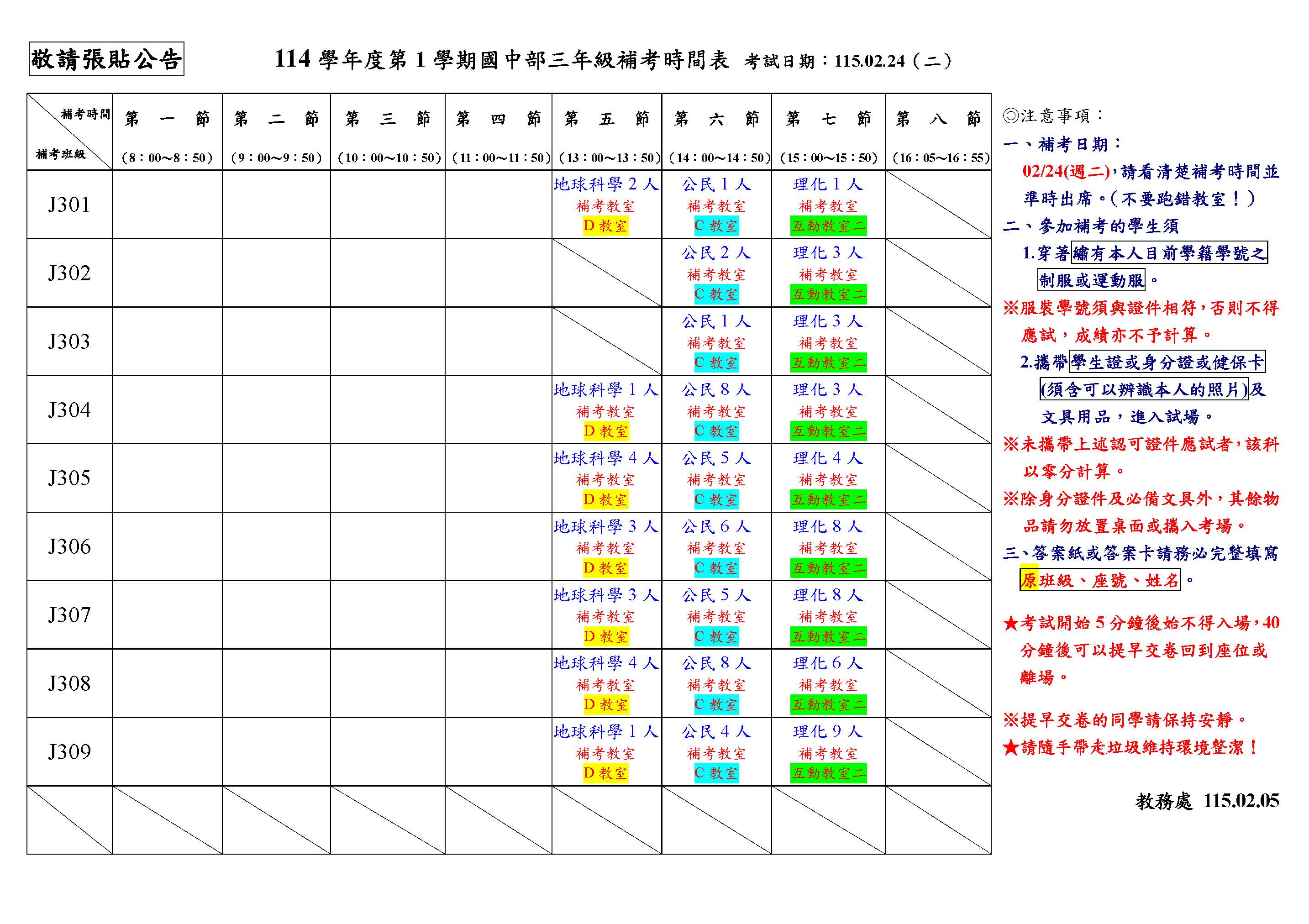 國中部—02/24(週二)下午、02/25(週三)全日。