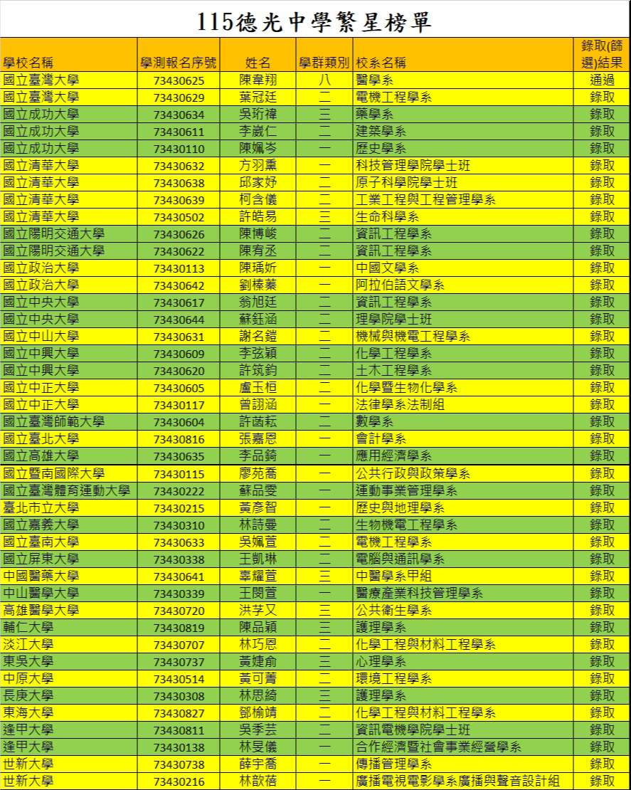 115德光中學繁星榜單 學校名稱 學測報名序號 姓名 學群類別 校系名稱 錄取(篩選)結果 國立臺灣大學 73430625 陳韋翔 八 醫學系 通過 國立臺灣大學 73430629 葉冠廷 二 電機工程學系 錄取 國立成功大學 73430634 吳珩禕 三 藥學系 錄取 國立成功大學 73430611 李崴仁 二 建築學系 錄取 國立成功大學 73430110 陳姵岑 一 歷史學系 錄取 國立清華大學 73430632 方羽熏 一 科技管理學院學士班 錄取 國立清華大學 73430638 邱家妤 二 原子科學院學士班 錄取 國立清華大學 73430639 柯含儀 二 工業工程與工程管理學系 錄取 國立清華大學 73430502 許皓易 三 生命科學系 錄取 國立陽明交通大學 73430626 陳博峻 二 資訊工程學系 錄取 國立陽明交通大學 73430622 陳宥丞 二 資訊工程學系 錄取 國立政治大學 73430113 陳瑀妡 一 中國文學系 錄取 國立政治大學 73430642 劉榛蓁 一 阿拉伯語文學系 錄取 國立中央大學 73430617 翁旭廷 二 資訊工程學系 錄取 國立中央大學 73430644 蘇鈺涵 二 理學院學士班 錄取 國立中山大學 73430631 謝名鎧 二 機械與機電工程學系 錄取 國立中興大學 73430609 李弦穎 二 化學工程學系 錄取 國立中興大學 73430620 許筑鈞 二 土木工程學系 錄取 國立中正大學 73430605 盧玉桓 二 化學暨生物化學系 錄取 國立中正大學 73430117 曾詡涵 一 法律學系法制組 錄取 國立臺灣師範大學 73430604 許菡耘 二 數學系 錄取 國立臺北大學 73430816 張嘉恩 一 會計學系 錄取 國立高雄大學 73430635 李品錡 一 應用經濟學系 錄取 國立暨南國際大學 73430115 廖苑喬 一 公共行政與政策學系 錄取 國立臺灣體育運動大學 73430222 蘇品雯 一 運動事業管理學系 錄取 臺北市立大學 73430215 黃彥智 一 歷史與地理學系 錄取 國立嘉義大學 73430310 林詩曼 二 生物機電工程學系 錄取 國立臺南大學 73430633 吳姵萱 二 電機工程學系 錄取 國立屏東大學 73430338 王凱琳 二 電腦與通訊學系 錄取 中國醫藥大學 73430641 辜耀萱 三 中醫學系甲組 錄取 中山醫學大學 73430339 王閔萱 一 醫療產業科技管理學系 錄取 高雄醫學大學 73430720 洪芓又 三 公共衛生學系 錄取 輔仁大學 73430819 陳品穎 三 護理學系 錄取 淡江大學 73430707 林巧恩 二 化學工程與材料工程學系 錄取 東吳大學 73430737 黃婕俞 三 心理學系 錄取 中原大學 73430514 黃可菁 二 環境工程學系 錄取 長庚大學 73430308 林思綺 三 護理學系 錄取 東海大學 73430827 鄧榆靖 二 化學工程與材料工程學系 錄取 逢甲大學 73430811 吳季芸 二 資訊電機學院學士班 錄取 逢甲大學 73430138 林旻儀 一 合作經濟暨社會事業經營學系 錄取 世新大學 73430738 薛宇喬 一 傳播管理學系 錄取 世新大學 73430216 林歆蓓 一 廣播電視電影學系廣播與聲音設計組 錄取